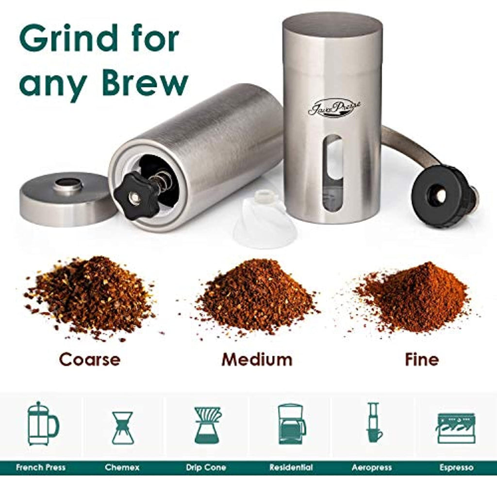 JavaPresse Manual Coffee Grinder with Adjustable Setting - Conical Burr Mill & Brushed Stainless Steel Whole Bean Burr Coffee Grinder for Aeropress, Drip Coffee, Espresso, French Press, Turkish Brew